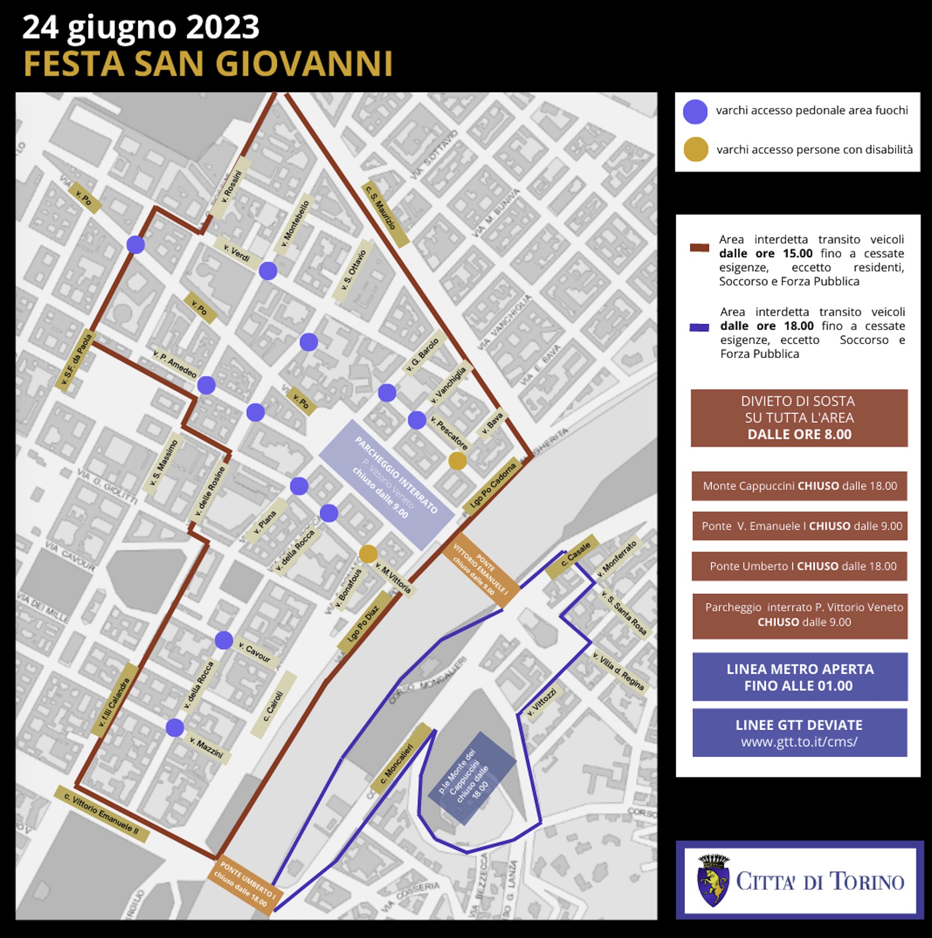 Dalle ore 15 di sabato 24 giugno e sino a cessate esigenze, e comunque sino a quando sarà rilevata presenza di pubblico, sarà vietata la somministrazione, la vendita, il consumo e la detenzione in luogo pubblico per asporto di bevande con contenitori idonei all’offesa della persona nelle vie racchiuse all'interno dell'area perimetrata dalle seguenti vie: lungo Po Cadorna; lungo Po Diaz; corso Cairoli; corso Vittorio Emanuele II (tratto compreso tra corso Cairoli e via della Rocca); via della Rocca (tratto compreso tra corso Vittorio Emanuele II e via Maria Vittoria); via Maria Vittoria (tratto compreso tra via della Rocca e piazza Carlo Emanuele II); piazza Carlo Emanuele II; via Maria Vittoria (tratto compreso tra piazza Carlo Emanuele II e via San Francesco da Paola); via San Francesco da Paola (tratto compreso tra via Maria Vittoria e via Po); via Po (tratto compreso tra le vie San Francesco da Paola / Vasco e piazza Castello); via Verdi; corso San Maurizio (tratto compreso tra via Verdi e lungo Po Cadorna).